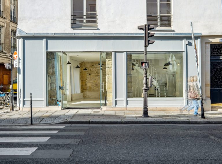 Light-filled corner gallery on rue de Turenne, steps from Place des Vosges. 70 m² with Parisian stone walls, full-height glazing and street visibility ideal for pop-ups, showrooms, press days and capsule retail.
