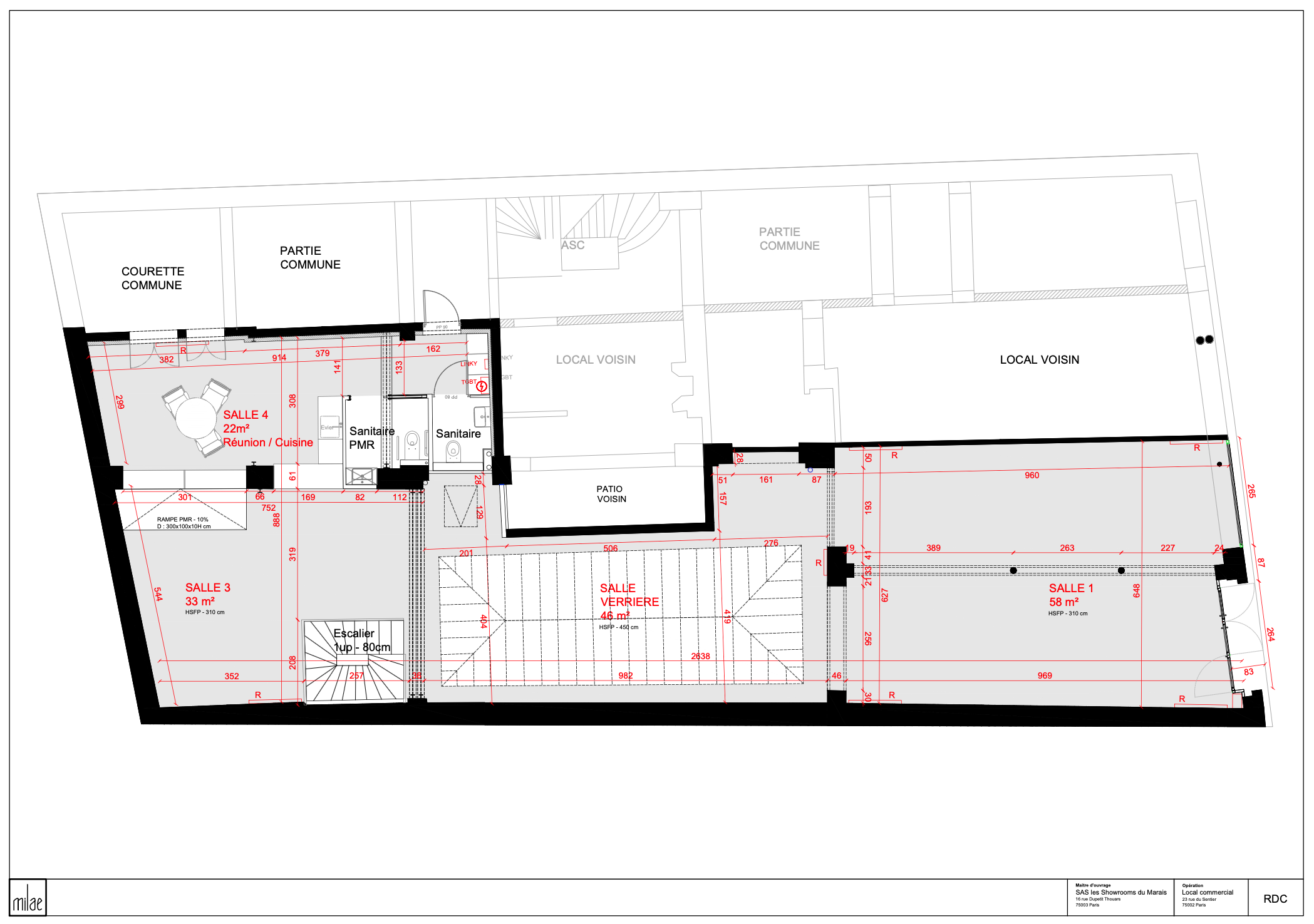 Address and size: 23 rue du Sentier, 75002 Paris, 230 m² total (170 m² ground floor + 60 m² basement)