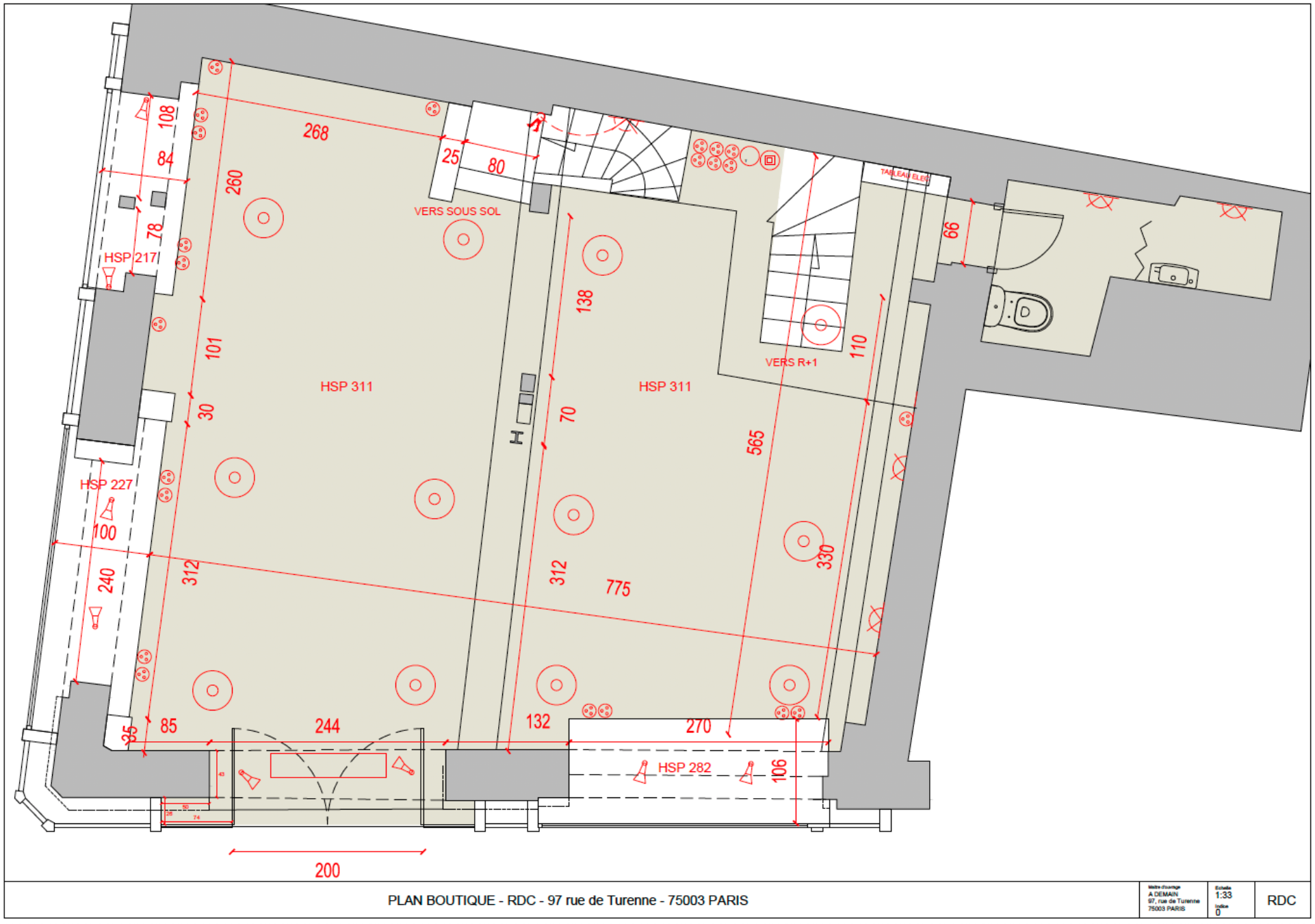 The corner frontage gives wraparound impact. On Turenne, you have a 2.70 m display window and a 1.90 m double door. On the Poitou side, two additional windows of roughly 2.7 m and 2.0 m extend the visual field around the corner and increase passerby capture.