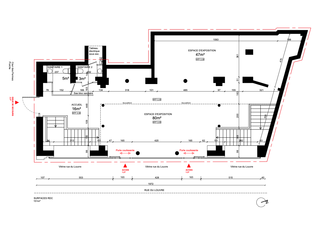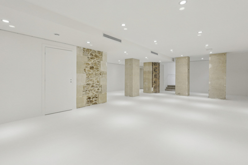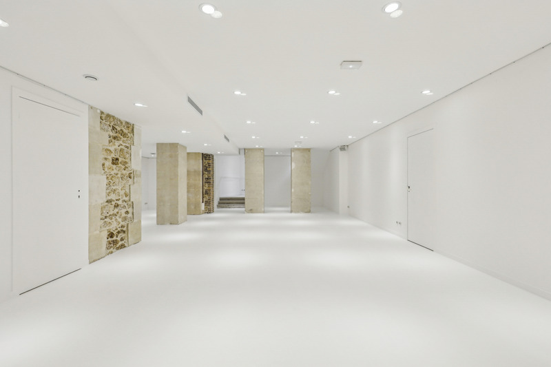 A pure gallery style showroom with real street presence, driven by approx. 15 m of glazed frontage on Rue du Louvre. Inside, a clean white cube volume is structured by raw stone columns for character and easy zoning. Total surface is approx. 300 m² across two levels, allowing a clear split between public presentation and support use.