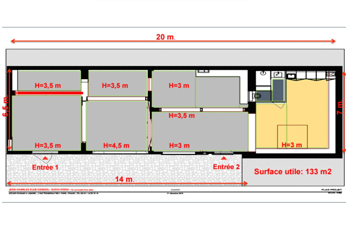 Layout: 20 m linear enfilade, dual access, courtyard façade